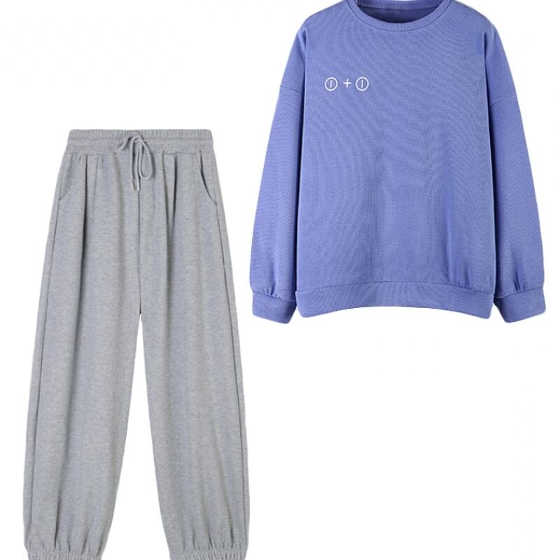 色:青いセーター,グレーのズボン